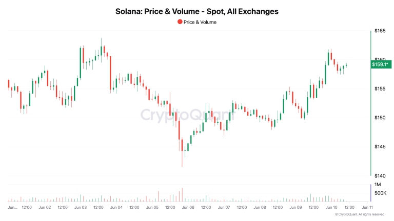 Solana rallied from $147.99 to $161.21 in the four days ending June 10. The move contrasts with the trend seen over the previous 30 days, where SOL slipped by nearly 2% as volatile macroeconomic conditions weighed on the altcoin market.
