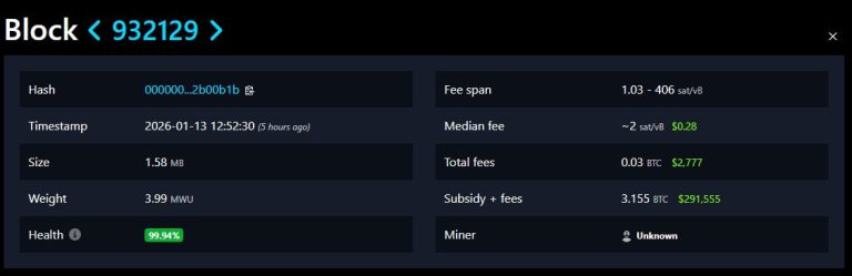A single address received the full block reward worth close to $300,000 at Bitcoin’s price of around $94,000. The payout structure suggests the win came through solo mining infrastructure. However, without a public claim from the miner or a verified pool tag in the coinbase, the exact setup remains ambiguous.